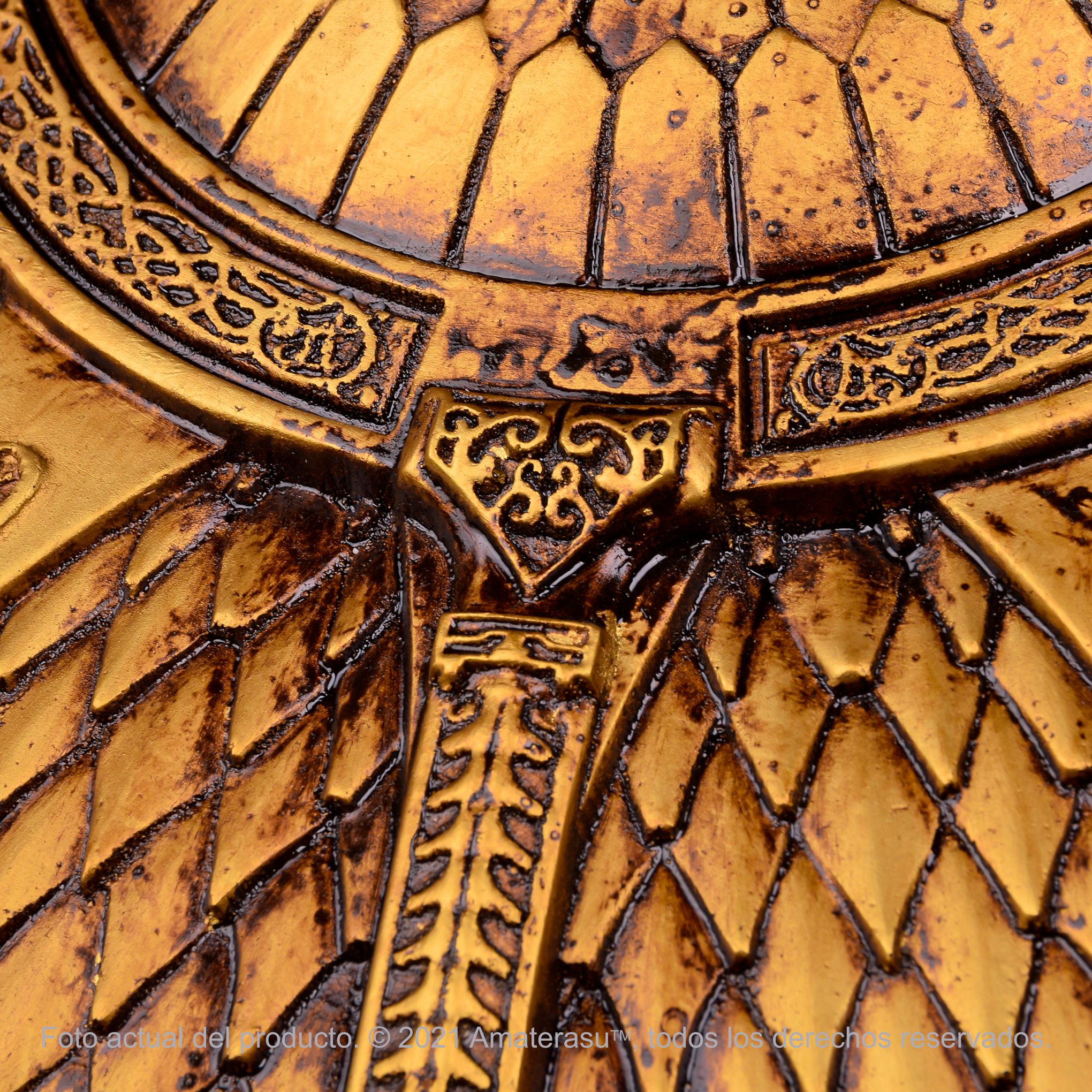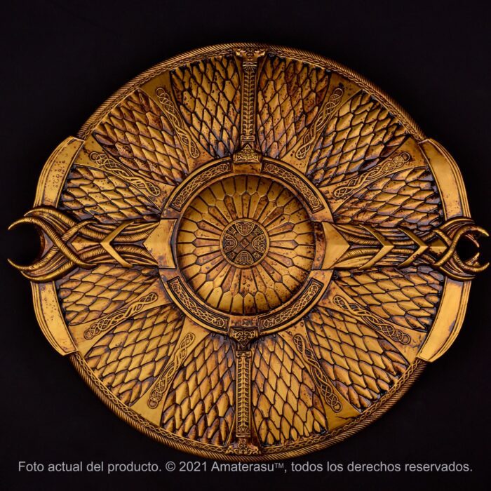 Esta recreación traslada ese concepto a una pieza de colección de gran presencia visual. El escudo está construido en resina reforzada con fibra de vidrio, lo que permite obtener buena rigidez estructural sin un peso excesivo para su tamaño.
