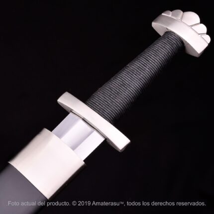 La hoja, fabricada en acero inoxidable 440, cuenta con un tratamiento estético que recrea las legendarias ondas del acero valyrio, otorgándole una profundidad visual única que evoca las forjas ancestrales. La empuñadura destaca por su acabado en cuero ecológico con un sofisticado encordado metálico, logrando una presencia visual destacada que se complementa con la guarda y el pomo en aleación de zinc, esculpidos con motivos que honran el linaje de los jinetes de dragón.