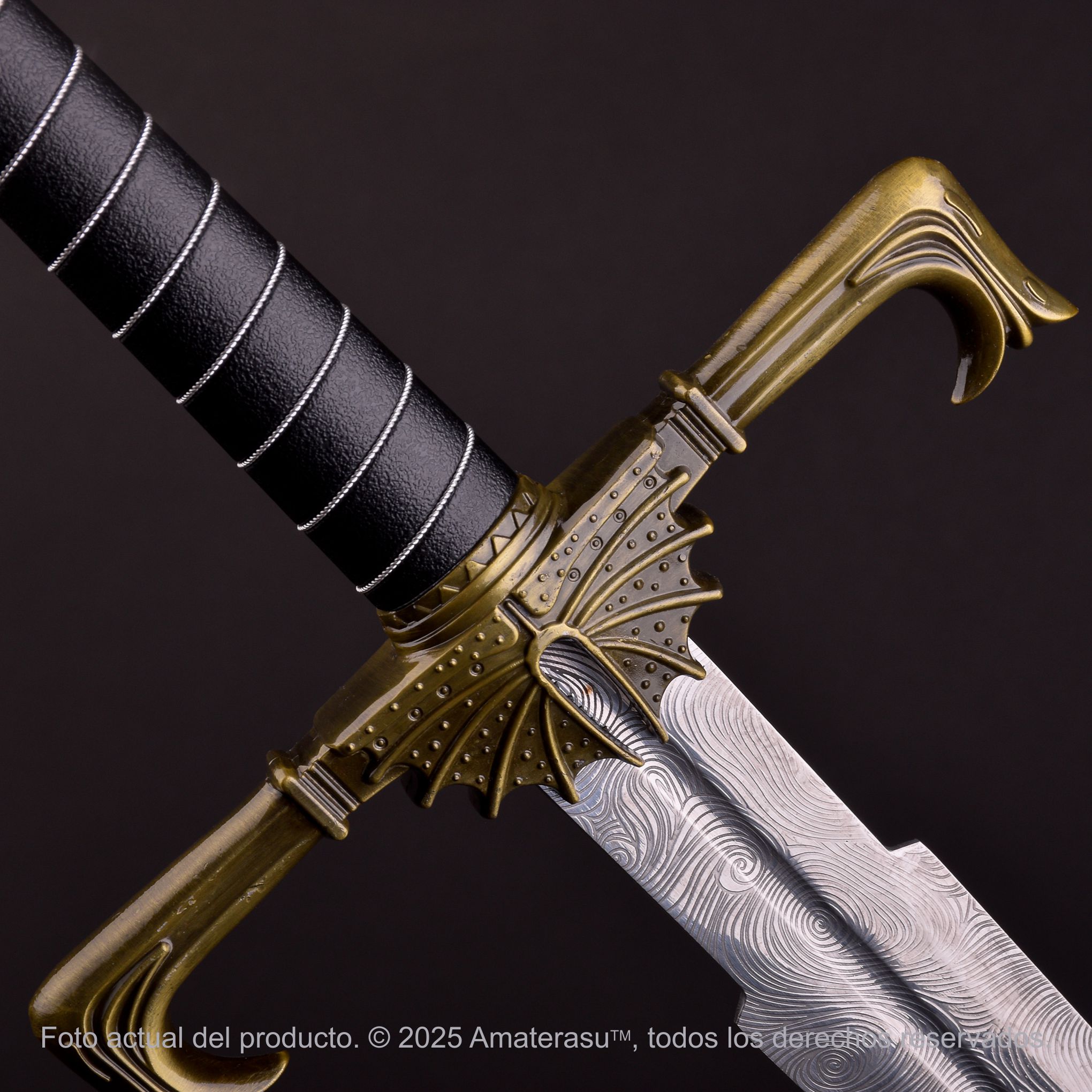 Reclama el trono con Fuegoscuro (Blackfyre), la espada de los Reyes. Esta imponente pieza de colección representa el máximo símbolo del poder Targaryen. Con una hoja de acero inoxidable 440 que emula el patrón del acero valyrio, empuñadura de cuero ecológico con encordado metálico y detalles en aleación de zinc, es la obra definitiva para los seguidores de House of the Dragon. Incluye panoplia de madera serigrafiada.