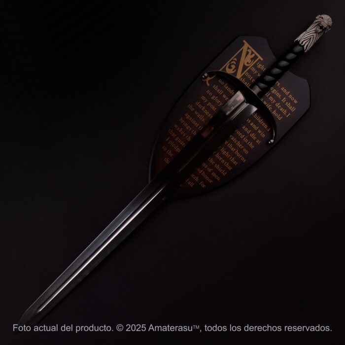 Pieza de colección – Exhibición y Coleccionismo: Aunque su construcción es masiva y respeta las proporciones de las “Bastard Swords” (espadas de mano y media), este artículo ha sido creado con un fin estrictamente decorativo y de colección. Su valor se ve potenciado por la inclusión de una panoplia de madera serigrafiada con el pacto de la Guardia de la Noche, permitiendo una exhibición de calidad profesional que honra el juramento de aquellos que visten el negro. Es la obra ideal para coronar una estancia, lista para ser instalada con los accesorios incluidos.