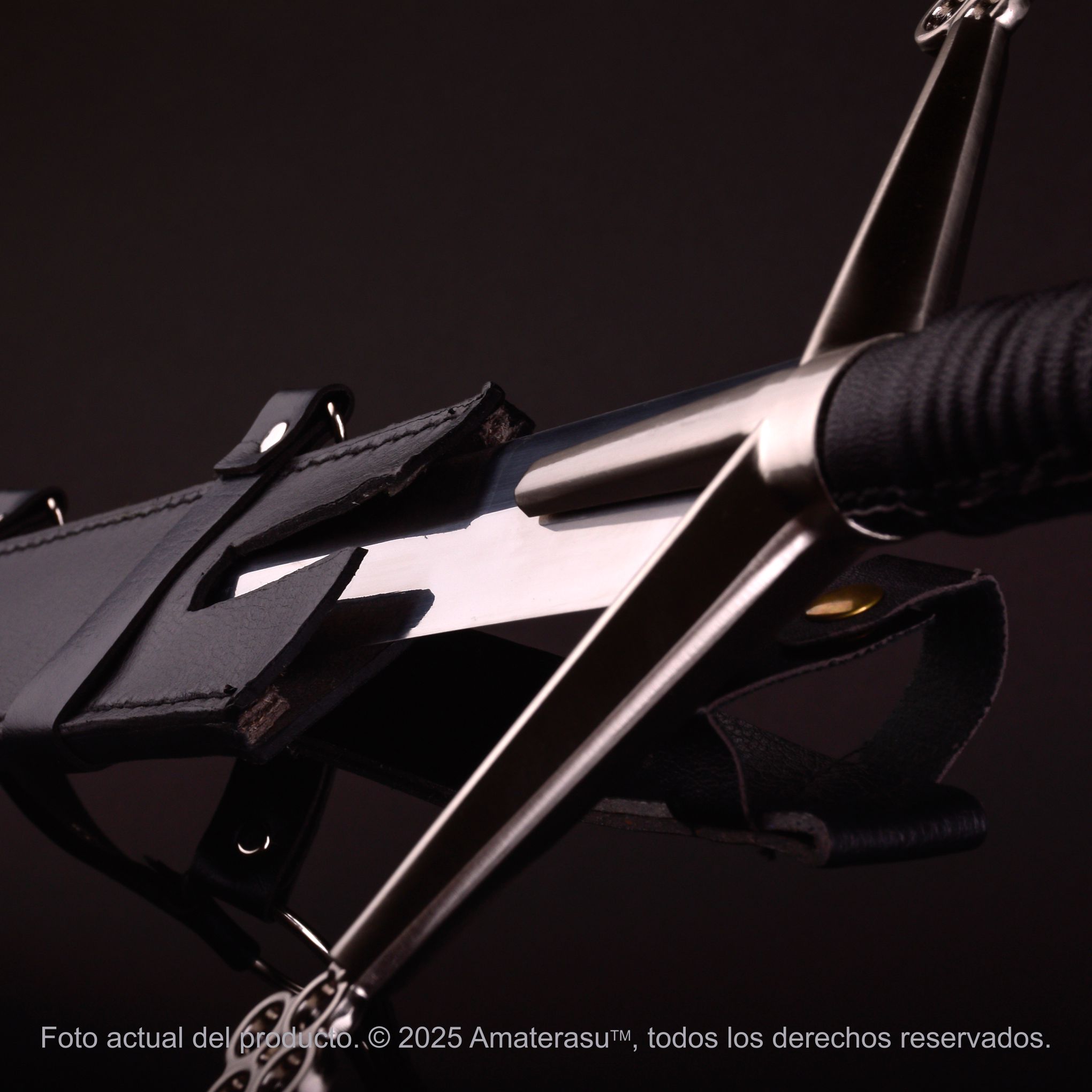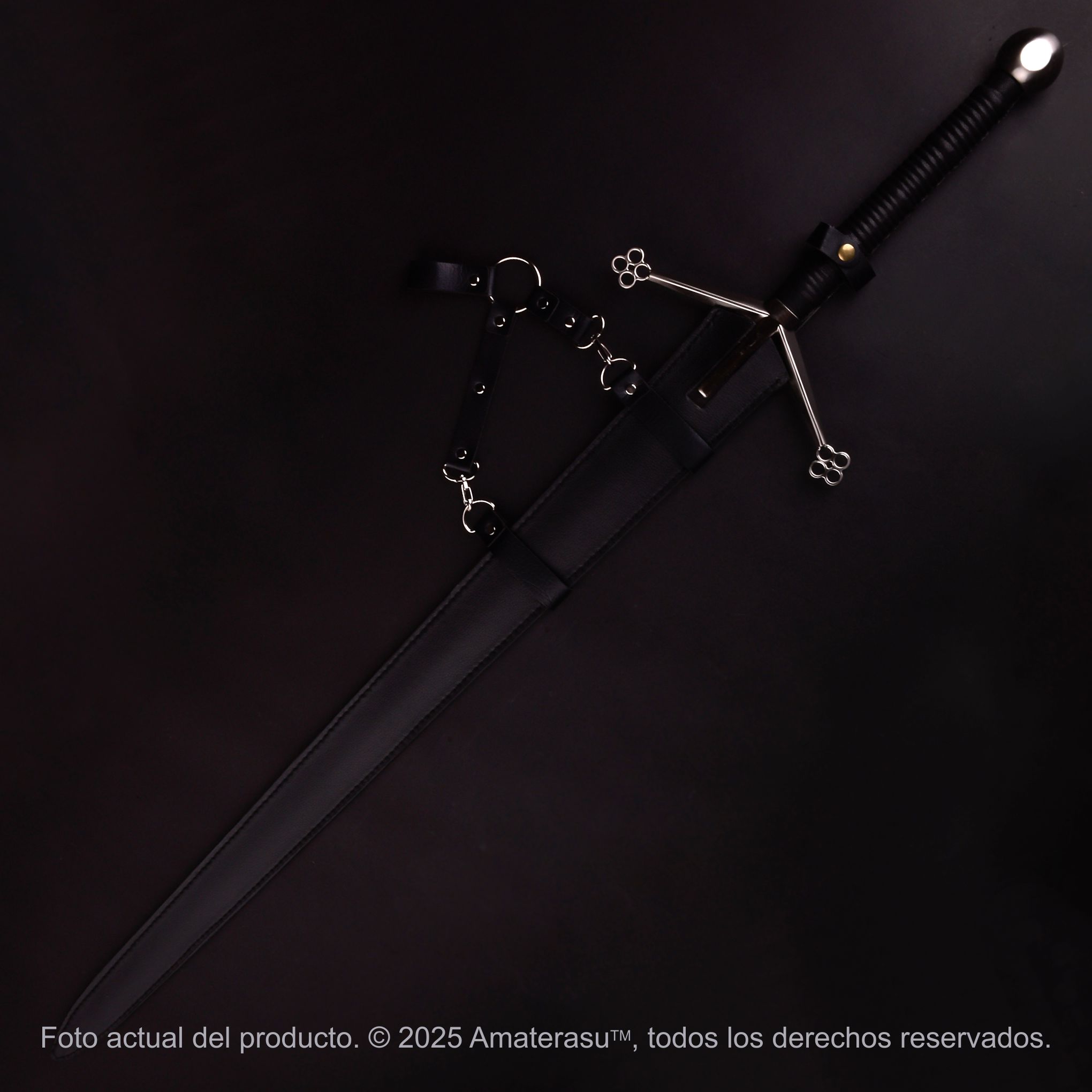 La hoja, fabricada artesanalmente en acero inoxidable, presenta filo propio de una hoja real de acero, aportando autenticidad material y coherencia estructural. Su geometría amplia y recta dialoga con el lenguaje clásico de las claymore, donde la escala y el equilibrio son protagonistas.