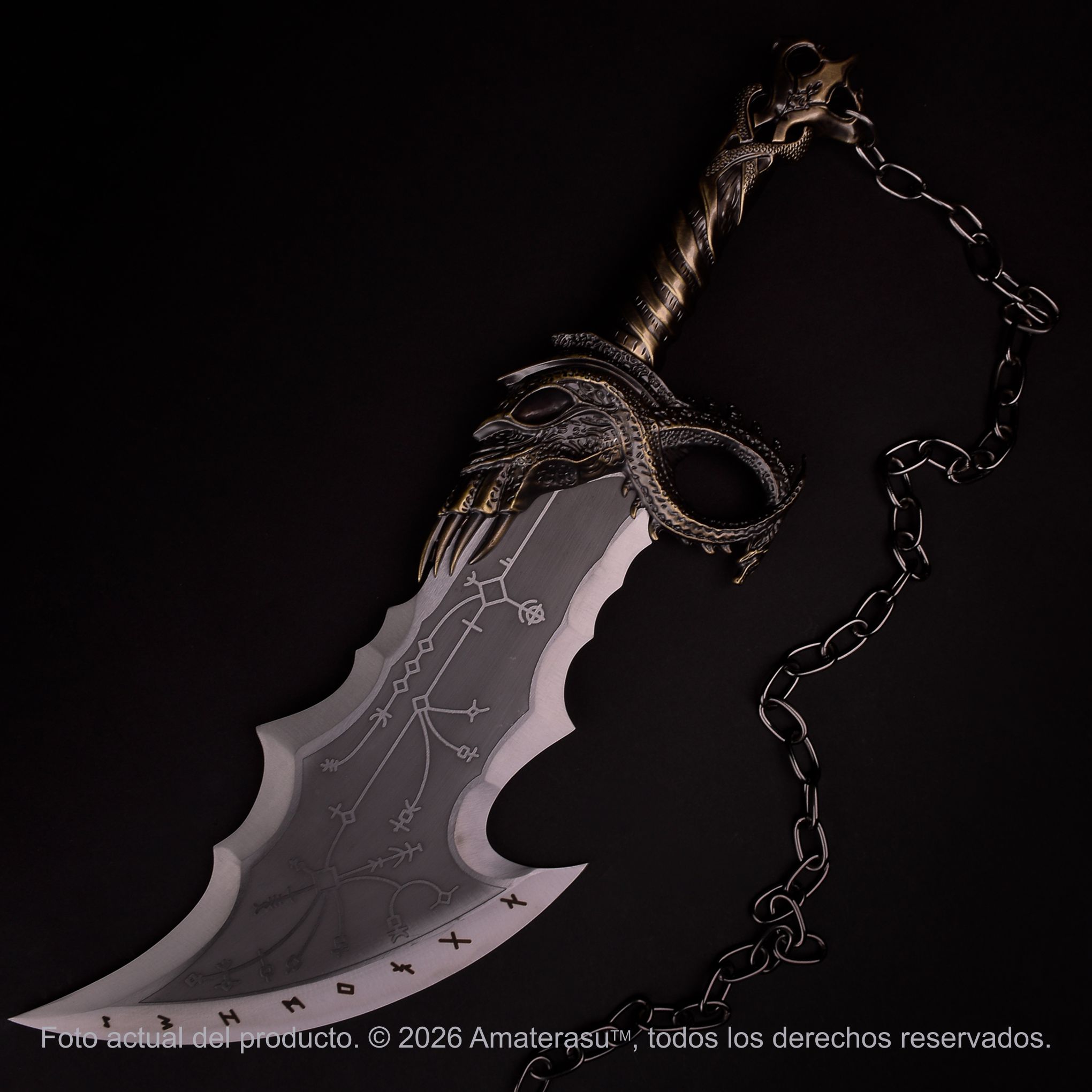 Pieza inspirada en las legendarias Espadas del Caos de Kratos en God of War Ragnarök. Fabricadas en acero inoxidable con grabados rúnicos en bajo relieve y empuñaduras de aleación de zinc. Pieza pensada para colección, cosplay y exhibición temática.
