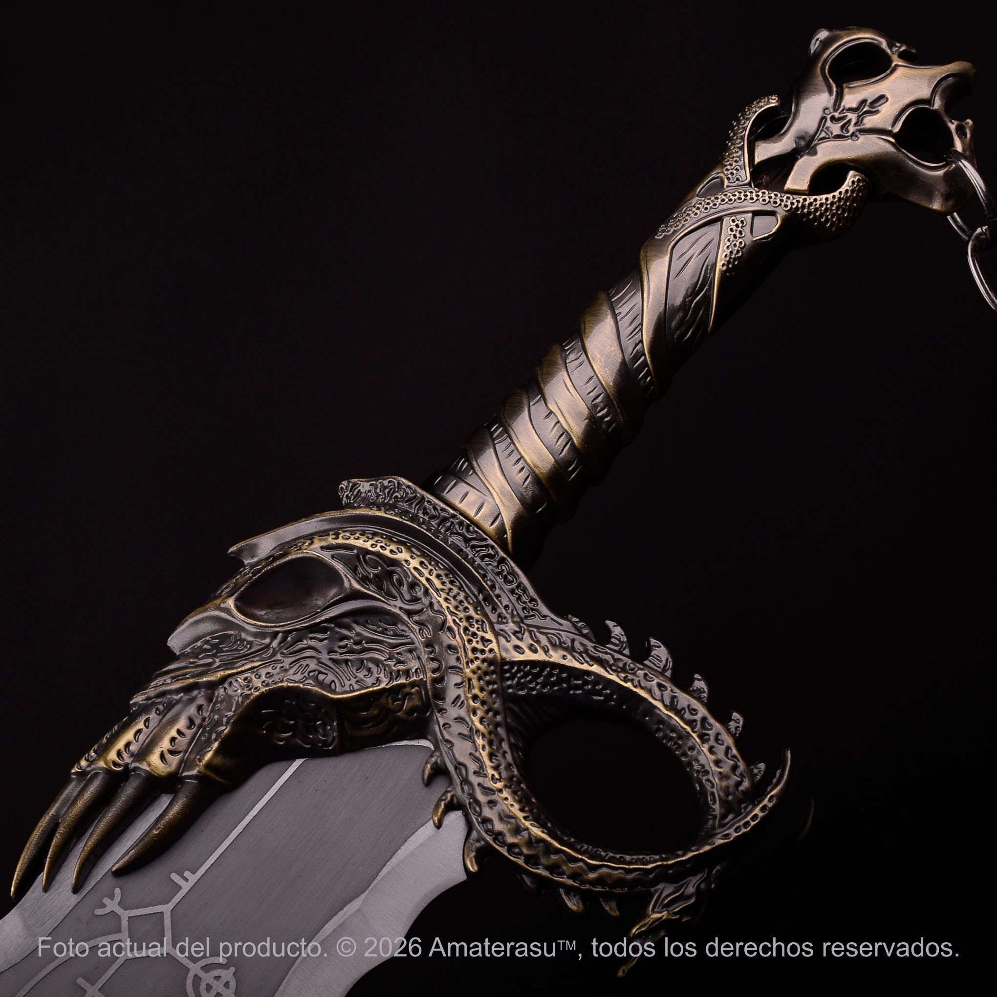 Esta recreación traslada ese concepto a una pieza de colección visualmente impactante. Las hojas están fabricadas en acero inoxidable con grabados rúnicos en bajo relieve que evocan la estética nórdica del juego. Las empuñaduras, guarda y pomo en aleación de zinc aportan solidez estructural y una presencia robusta.