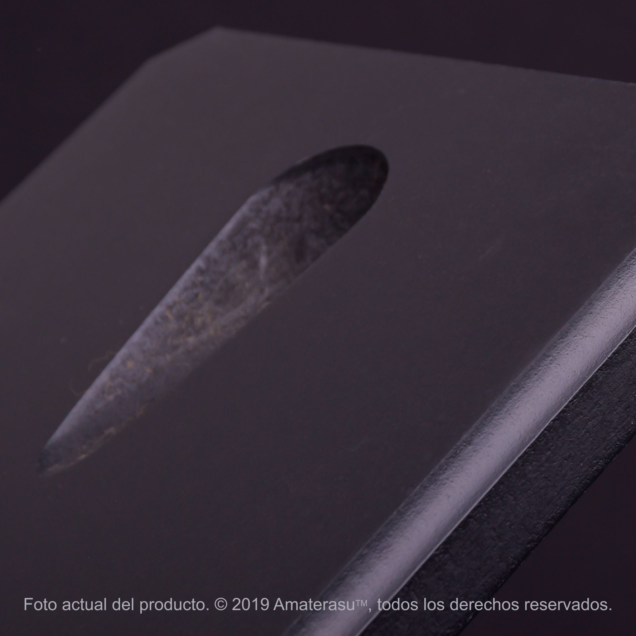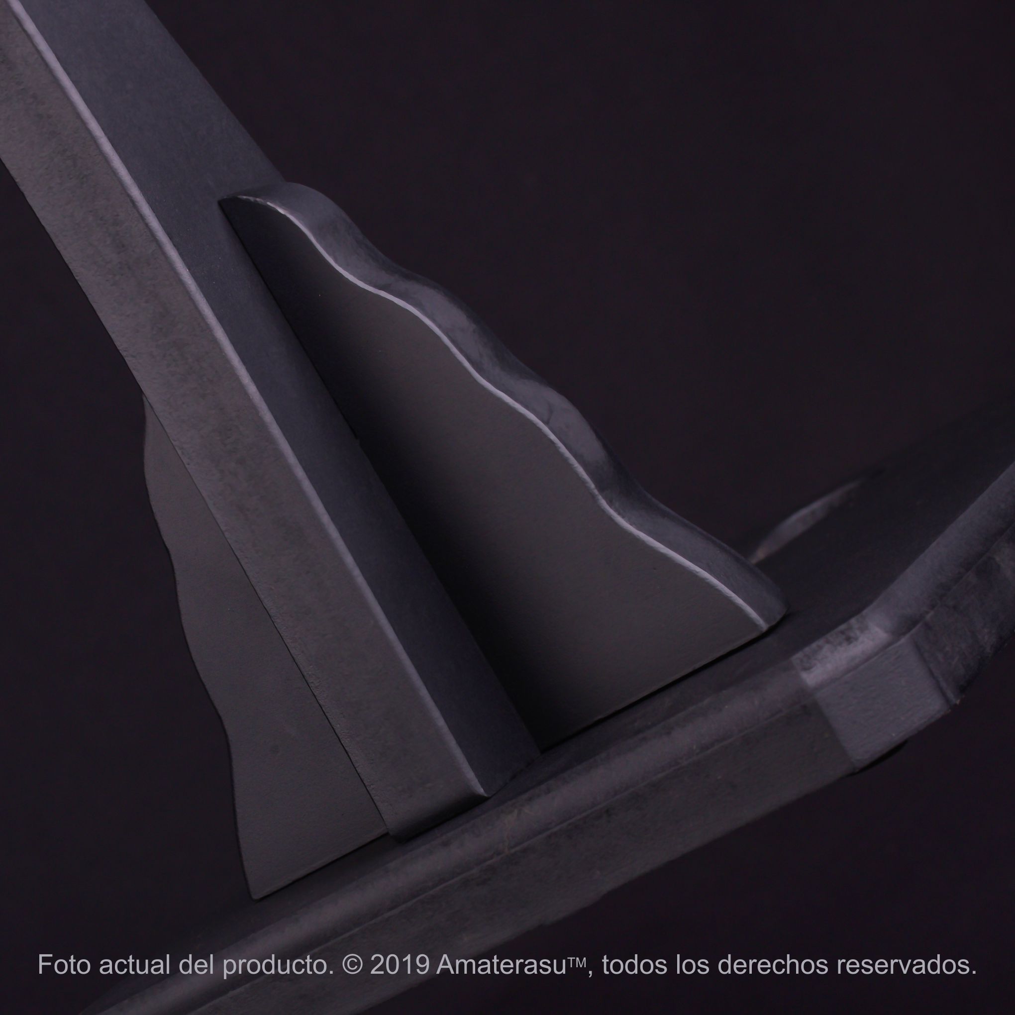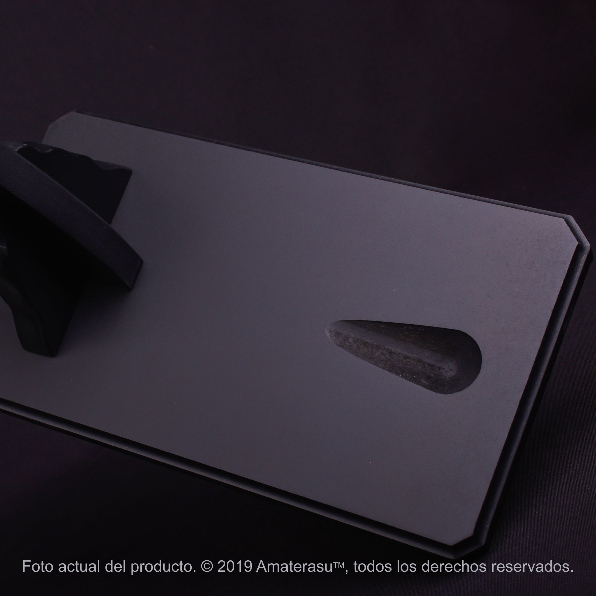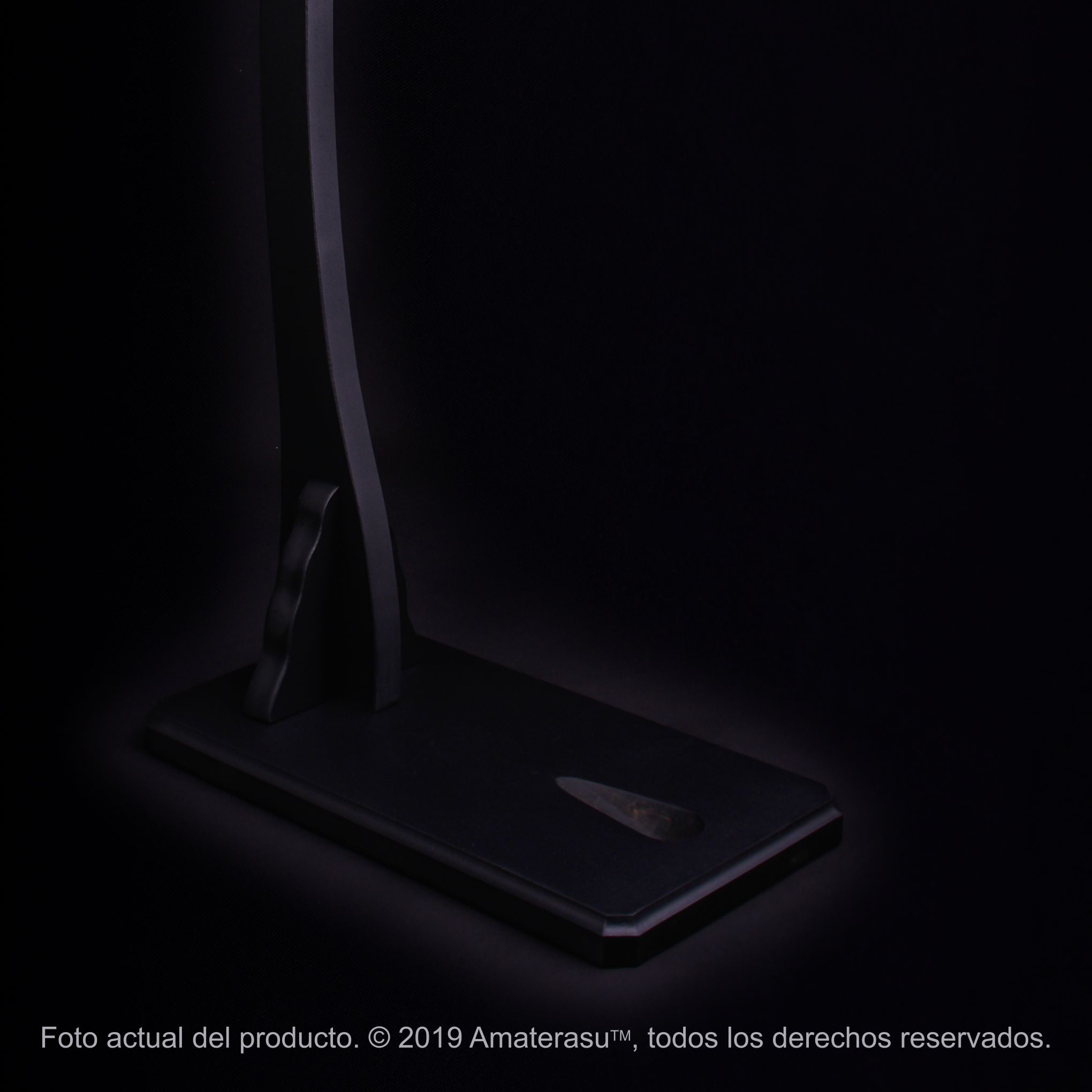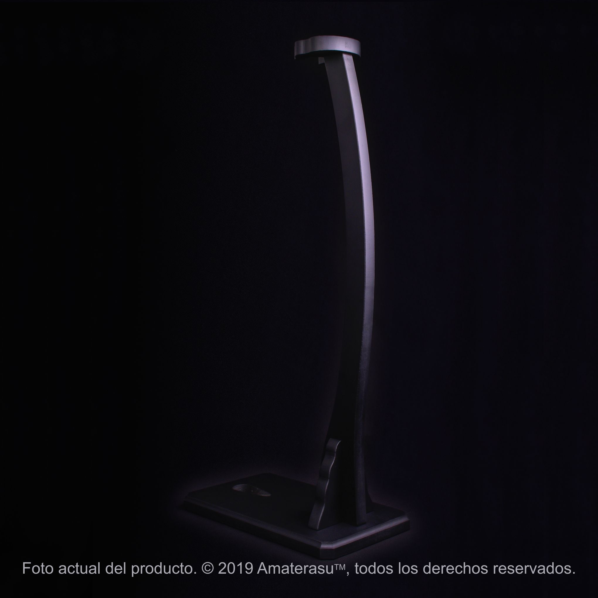 Fabricado en madera con terminación negro mate, ofrece una estética sobria que acompaña tanto ambientes modernos como clásicos. Su base amplia brinda estabilidad, mientras el diseño general mantiene una presencia equilibrada sin competir con la espada.