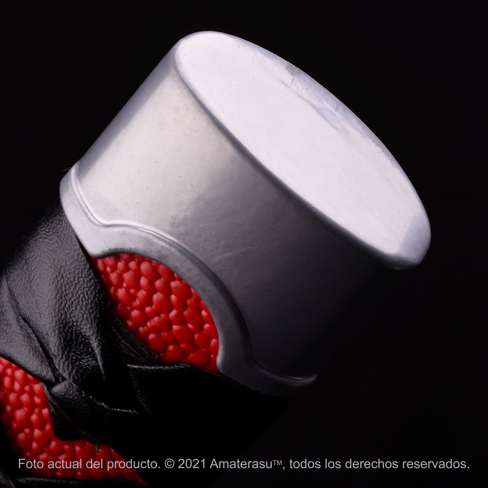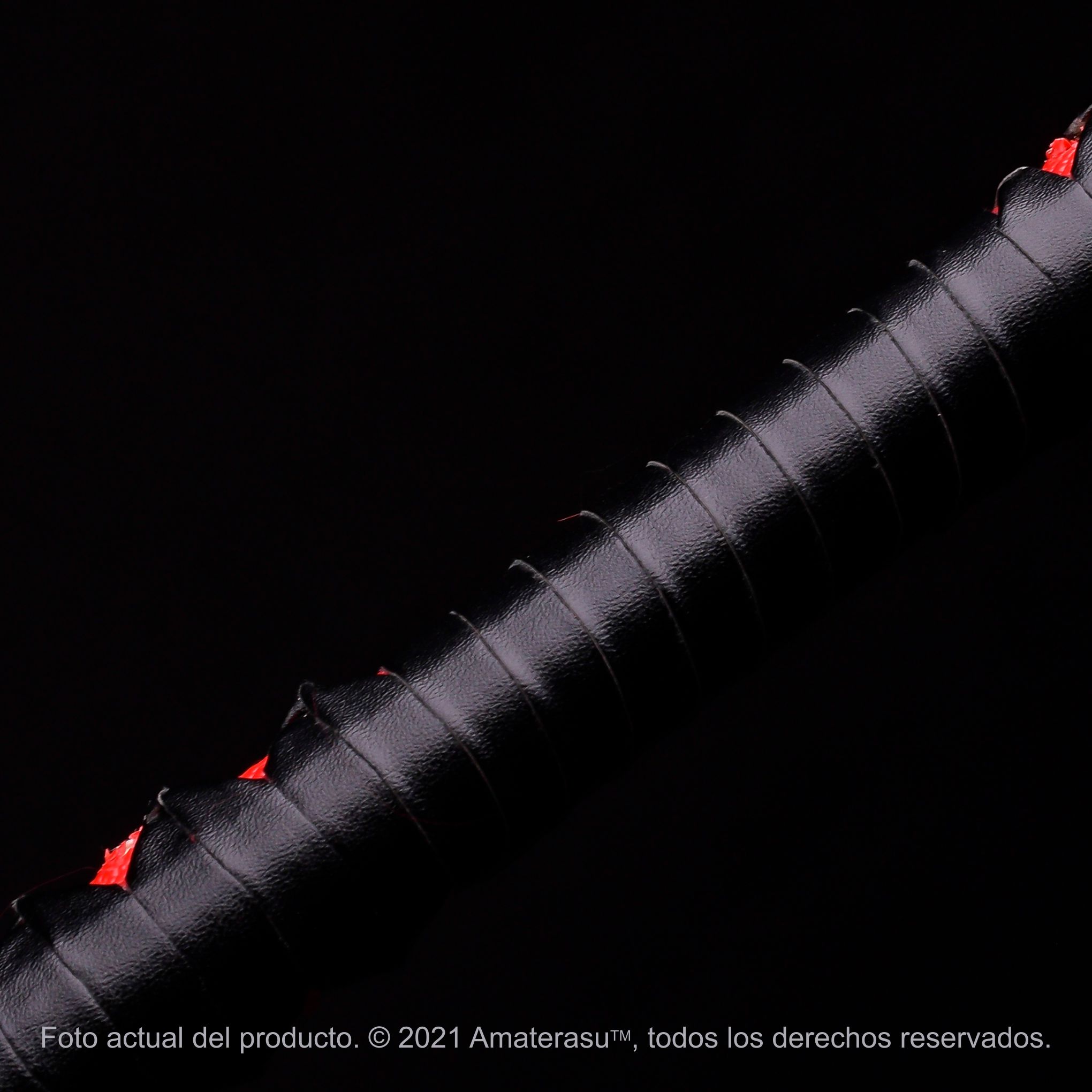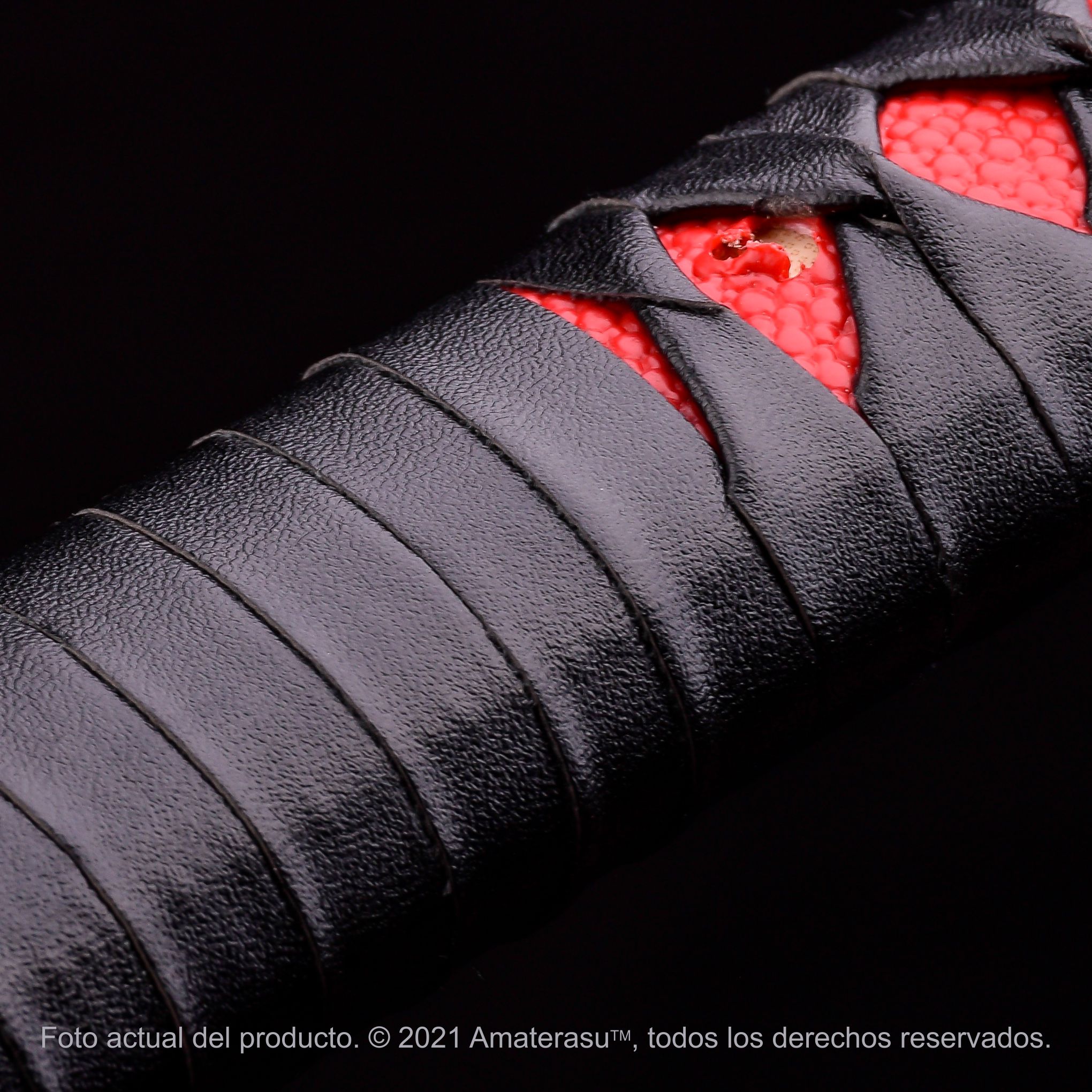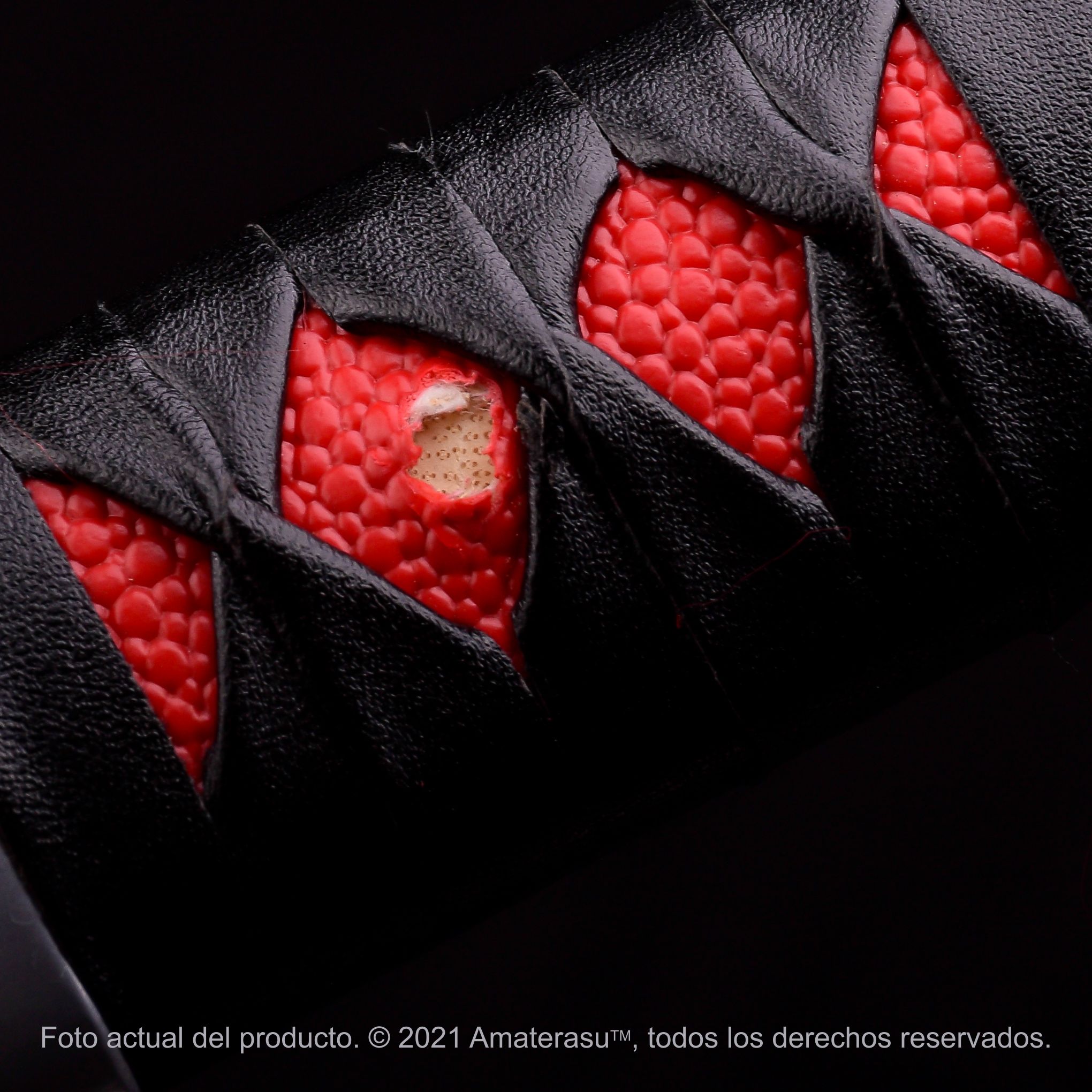 La tsuka con same ecológico rojo y el ito en cuero ecológico refuerzan esa presencia firme, transmitiendo decisión y fortaleza incluso en reposo.