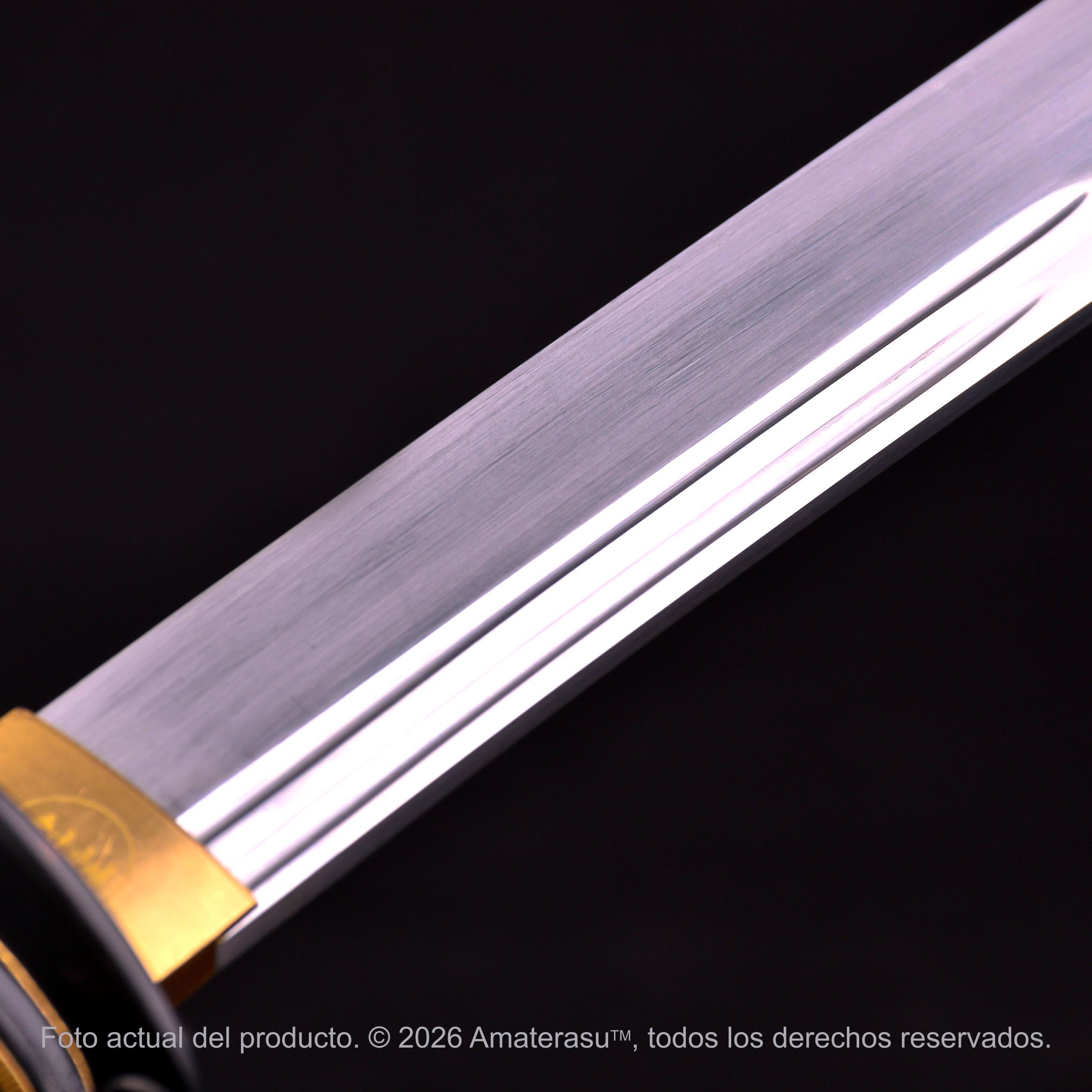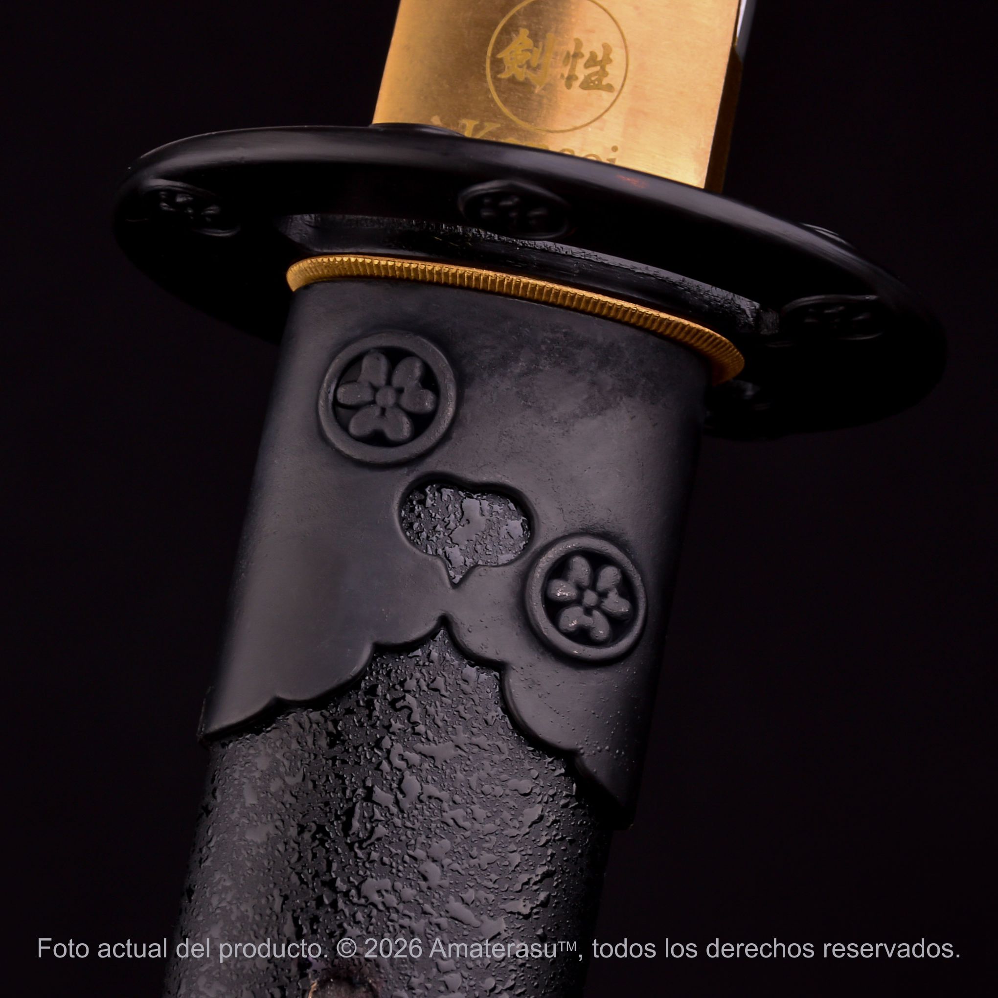 El nagaye (asta) está realizado en madera noble y presenta un acabado Ishime negro mate texturizado, evocando terminaciones tradicionales japonesas y aportando un contraste sobrio frente a los detalles decorativos. Las monturas (kanagu), la tsuba y los componentes en latón completan un conjunto equilibrado, donde cada elemento dialoga entre funcionalidad histórica y expresión estética.